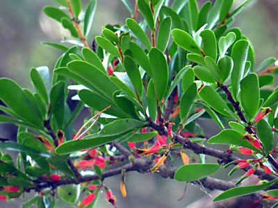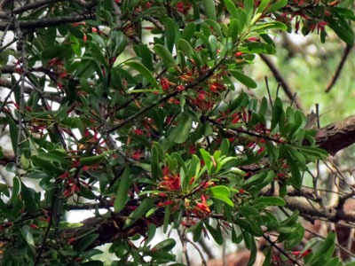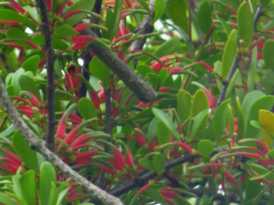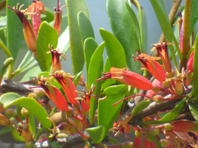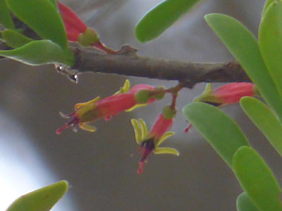 葉腋に赤い筒型の花が1〜4個集まって付いている。 多くがつぼみの状態 |
