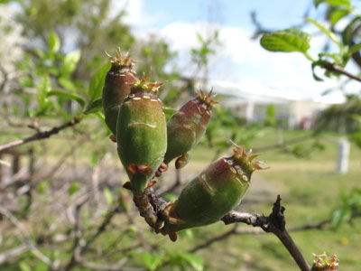 花が終わと花床が大きくなり、小さい果実(偽果)の赤ちゃん(1cm以下)が出来始めていました。 先端に雄しべが残っている。 |