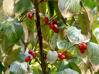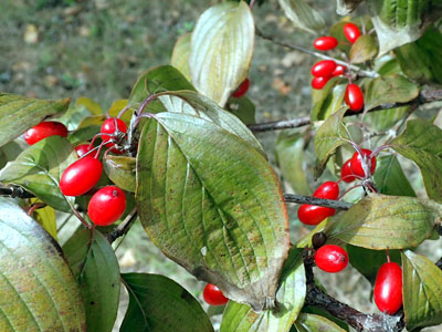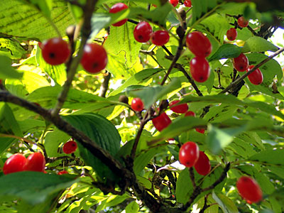サンシュユの葉と果実