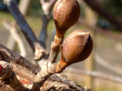 | 総苞片に包まれたつぼみ。花芽は丸く短枝の先につく。 | |