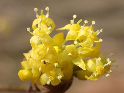 葉が展開する前に開花する。 別名ハルコガネバナの名のごとく黄色い小さい花を多数咲かせる。 |