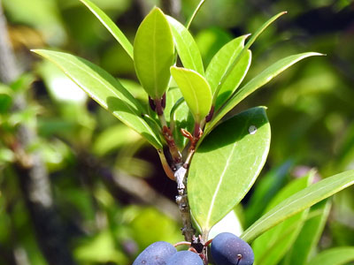 | 葉は対生。葉身の長さは3〜7cm、幅2〜4cmの楕円形.。厚い革質で硬く、表面は光沢がある。 | |