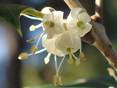 | 雌雄別株。葉腋に香よい白い花が束生。花冠は4裂し、裂片は反り返る。 | |