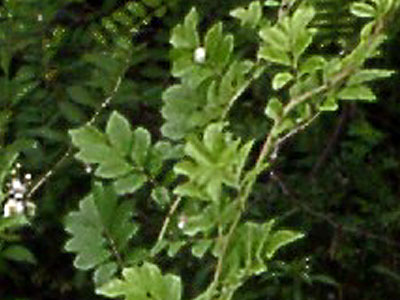 葉は互生。長さ10cmほどの奇数羽状複葉。 小葉は3〜4対。長さ2〜5cmの卵形または長楕円形。ふちに鋭い鋸葉。 |
