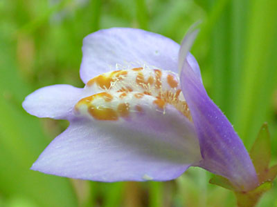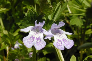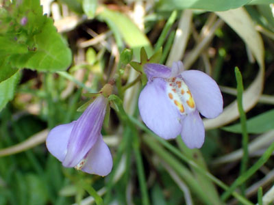 花冠は淡紫色で上下2唇に分かれる。 下唇の上面には2個の膨らみがあり、 こん棒状の毛と黄褐色の斑紋がある。 |