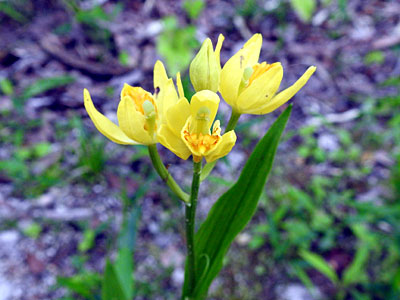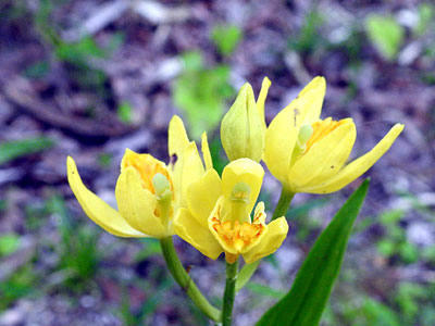 茎の頂に数個の黄色い花が付く。 花弁3、萼片3。萼片も花弁状。 |