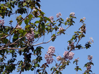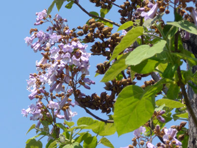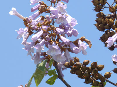 枝先に大きな円錐花序の淡紫色の花 ここで見たキリの花にはたくさんの斑点が見られました。 |