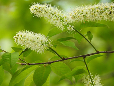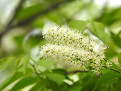 新枝の先が伸びた 長さ8〜15cmの総状花序に 白い花が多数密集してつく。 花は直径6mm。花弁は5個。 長く突き出た雄しべが目立つ。 |
