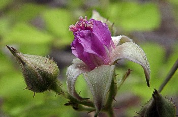 キイチゴ属の花はほとんどが白い花ですが、これは花弁がピンク色。5枚のガクは反り返っていますが5枚の花弁は立ち上がっています。 |