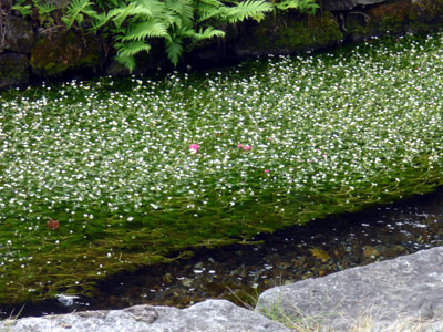 清流に流れをまかせた緑色の藻の上に、一面に開花したバイカモの花を満喫してきました。