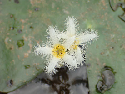 葉柄の基部から花柄が出て白い花をつける。 花冠は径約1.5cm、深く5裂、 中心部だけ黄色で、 裂片のへりはふさのように裂けている。 |