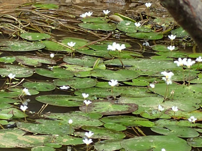 葉は沈水し、葉身は細かく裂け、糸状の裂片に。 花は葉腋から伸びた花茎(長さ3〜5cm)の先につき、 白色の花弁が5枚、水上で開花。(花は直径約1〜1.5cm) |
