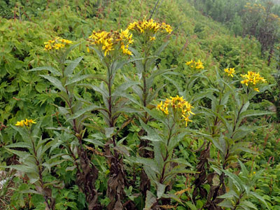 茎は60〜120cm、葉はやや質厚く、長さ10〜17cm、幅3〜6cmで端は尖っている。 頭花は径2cmほどで、密集して傘状の花序となっている。舌状花は黄色。 |