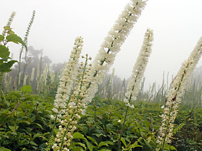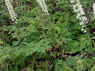 サラシナショウマの群生は壮観でした。 背丈は40〜150cmほどあり、葉は互生、長い枝に白い花を咲かせる。 |