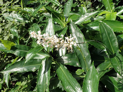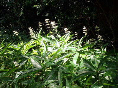 8/19 大阪府枚方市方面へ。山田池公園内で多くのヤブミョウガ植えられて白い花が咲き出していました。