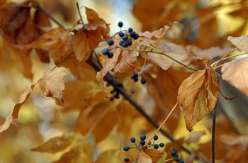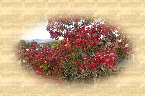 鮮やかな「どうだんもみじ」、果実は刮ハで上向きに付く
