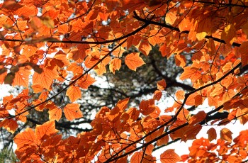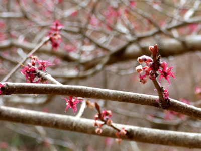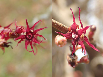 11/24 神戸市立森林植物園に出かけました。紅葉したマルバノキにマンサクのような小さい花がが咲きだしていました。