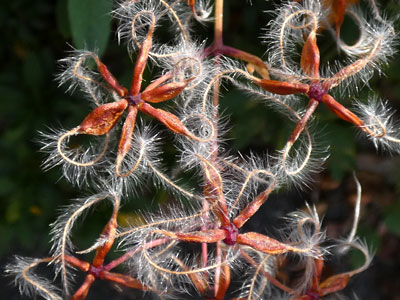 果実は痩果(そう果)。果実は種子のように見える。(薄い果肉が種子とくっ付いている) 花時に花柱だった部分が3cmほど伸びて、白い羽毛のようになり、風で飛び散る。 センニンソウのページもご覧ください。 |