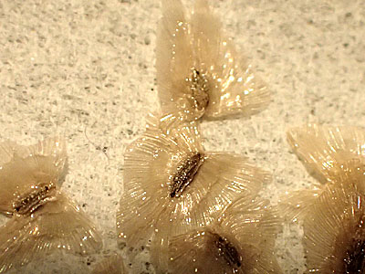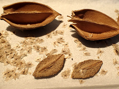 果実は刮ハ、2裂した果実と胎座、たくさんの種子。 |