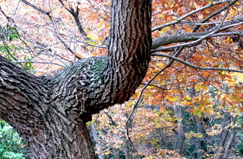 コナラの樹皮は灰黒色。 縦に不規則な裂け目がある。 |