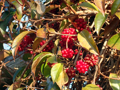 1/2 三田市の県立公園内でサネカズラの果実、小野市ではクチナシの果実に出会いました。どちらも鈴なりでした。