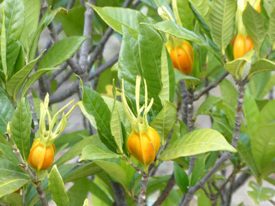 ここで見たクチナシは高さ2mぐらいの大木でした。 果実は液果。長さ2〜3cmの楕円形で、5〜7稜あり、先端に萼片が残る。 |