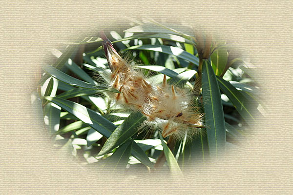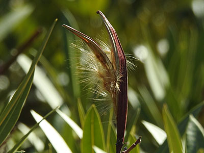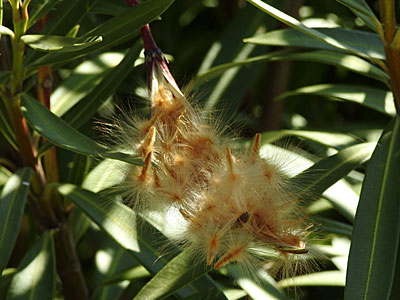 2/21 高浜町のキョウチクトウの果実が裂けはじめ、。冠毛の付いた種子が飛び出し始めていました。