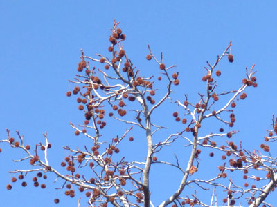園内ではモミジバフウの実がたくさん残っていました。落葉したモミジバフウ、上部の枝は白いことがよく分かりました。