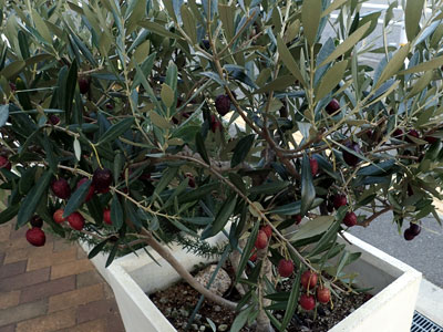 1/9 高浜町のライフサポートステーションの玄関先の鉢に植えられたオリーブの木に赤く熟した果実が実っていました。