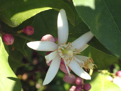 レモンのつぼみは薄紫色 花は直径3〜4cm、花弁の外側が紫色を帯びる。 |