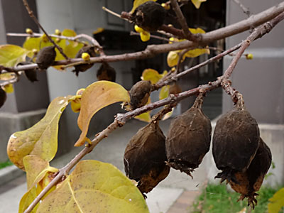 1/11 高浜団地の庭ではソシンロウバイの花が咲き出していました。昨年出来た果実がたくさん木に残っています。
