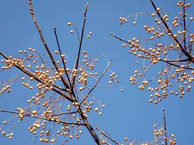 2/2 中央緑道のセンダンの果実が枝に残って、青空に美しく映えていました。