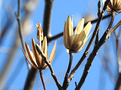 1/13 臨港線(大東町付近)では ユリノキのコップ状に残った翼果(果実)がたくさん見られました。