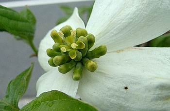 白く花弁のように見えるのは総苞片、 その中心に黄緑色の小さな花が15〜20個集まって球形の頭状花序をつけている。花弁は4個、おしべ4個。 |