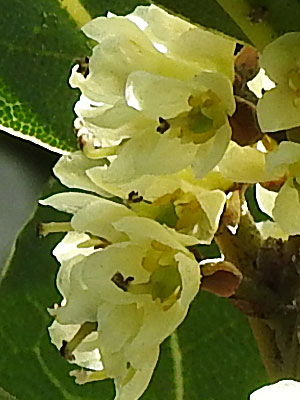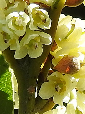 4/13 浜風南公園ではゲッケイジュの雄花がたくさん咲き出していました。ちかくでは雌花序(雌花)も見られました。