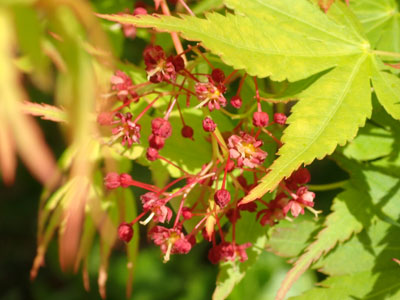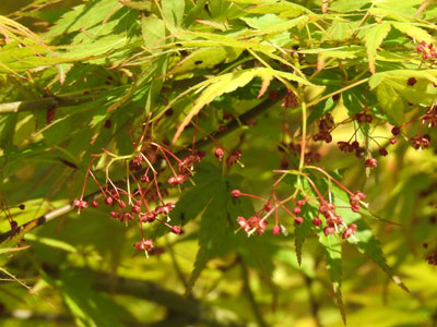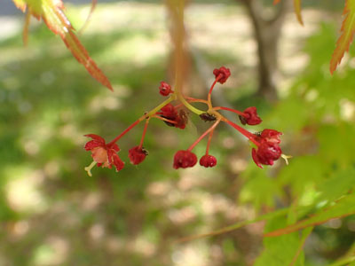イロハモミジの花は雌雄同株。 一つの花序に雄花と両性花が混生。 |