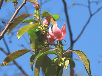 短枝の枝先に淡紅色の花を1個づつ咲かせる。 葉は互生、傾卵形または楕円形。ふちには線形の鋸葉。 |