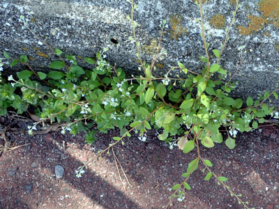 葉は対生。葉の先端は鋭く尖り、基部はハート型または円形。ふちは鋭い重鋸葉。 花は枝先に直径3〜4cmの白色の花を1個付ける。花弁は4個。 |