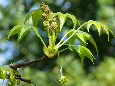 雌雄同株、葉の展開と同時に雄花、雌花はそれぞれの頭状花序を作る。 総状に付いているのが雄花序、柄の先にぶら下っているのは雌花序。 樹木ウォッチング モミジバフウのページもご覧ください。 |