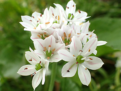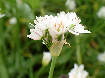 ニラの花茎の高さ30cmほどで、 その先には長さ2cmほどの柄をもつ多くの花が 包葉に包まれている。 花は純白色、おしべ6、めしべ1 |