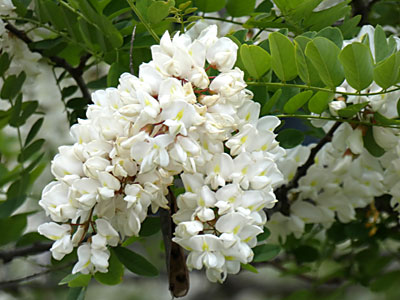 別名 ハリエンジュ 葉腋から長さ10〜15cmの総状花序を垂らす、香りのよい白色の蝶形花を多数つける 樹木ウォッチング ニセアカシアのページもご覧ください。 |