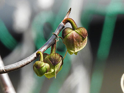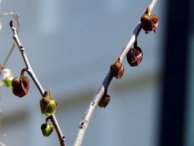 4/14 シーサイドタウン内 高浜町団地の庭ではポポーの花が咲き出していました。