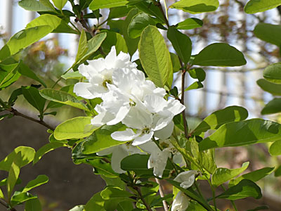 枝先に円錐花序をだし、直径4cmほどの白い花を6〜10個付ける。 葉は互生、楕円形、先端は丸く、基部は急に細くなる。 |