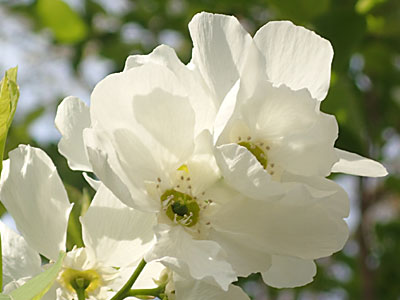 枝先に円錐花序をだし、直径4cmほどの花を 6〜10個つける。 花弁は円形、雄しべ15〜25個、花柱は5個。葉は互生、楕円形、先端は丸く、基部はクサビ形。 |