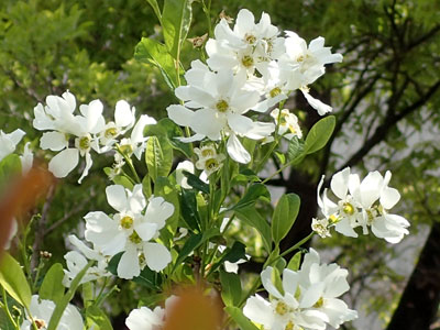 4/3 若葉町団地の庭でリユウバイの白い花が咲きだしていました。