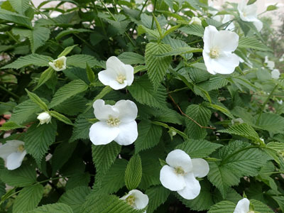 4/8 高浜団地の庭ではシロヤマブキの花が咲きだしていました。