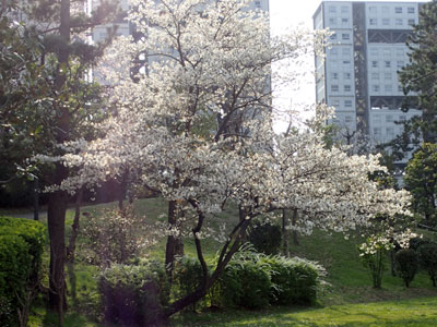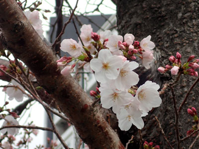 3/23 高浜団地の庭では昨年サクランボが実ったサクラの木が早くも満開に。