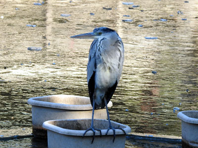 1/10 西浜公園では連日の氷点下の気温で池が凍てついていました。アオサギが1羽池の中央に佇んでいました。