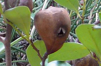 ヒョンノキの名の由来は、 木化した虫えいから虫がいなくなった虫エイを吹くと「ヒョウ」と鳴るので付いたようです。 |