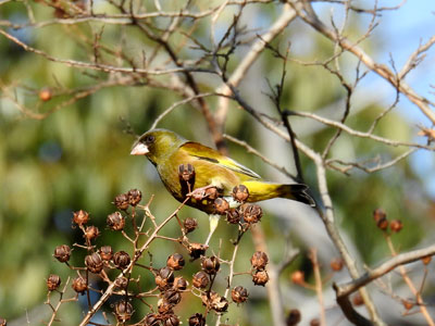 サルスベリにカワラヒワ 西浜公園 2020/1/19撮影 |